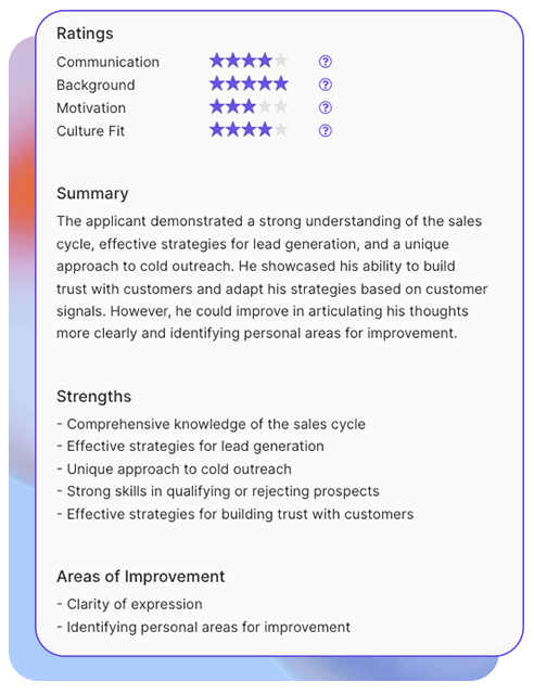 Interviews are personalized to the role, candidate's experience, and adapts to their responses. AI scoring removes the bias and scores candidate's consistently on your company's criteria.
